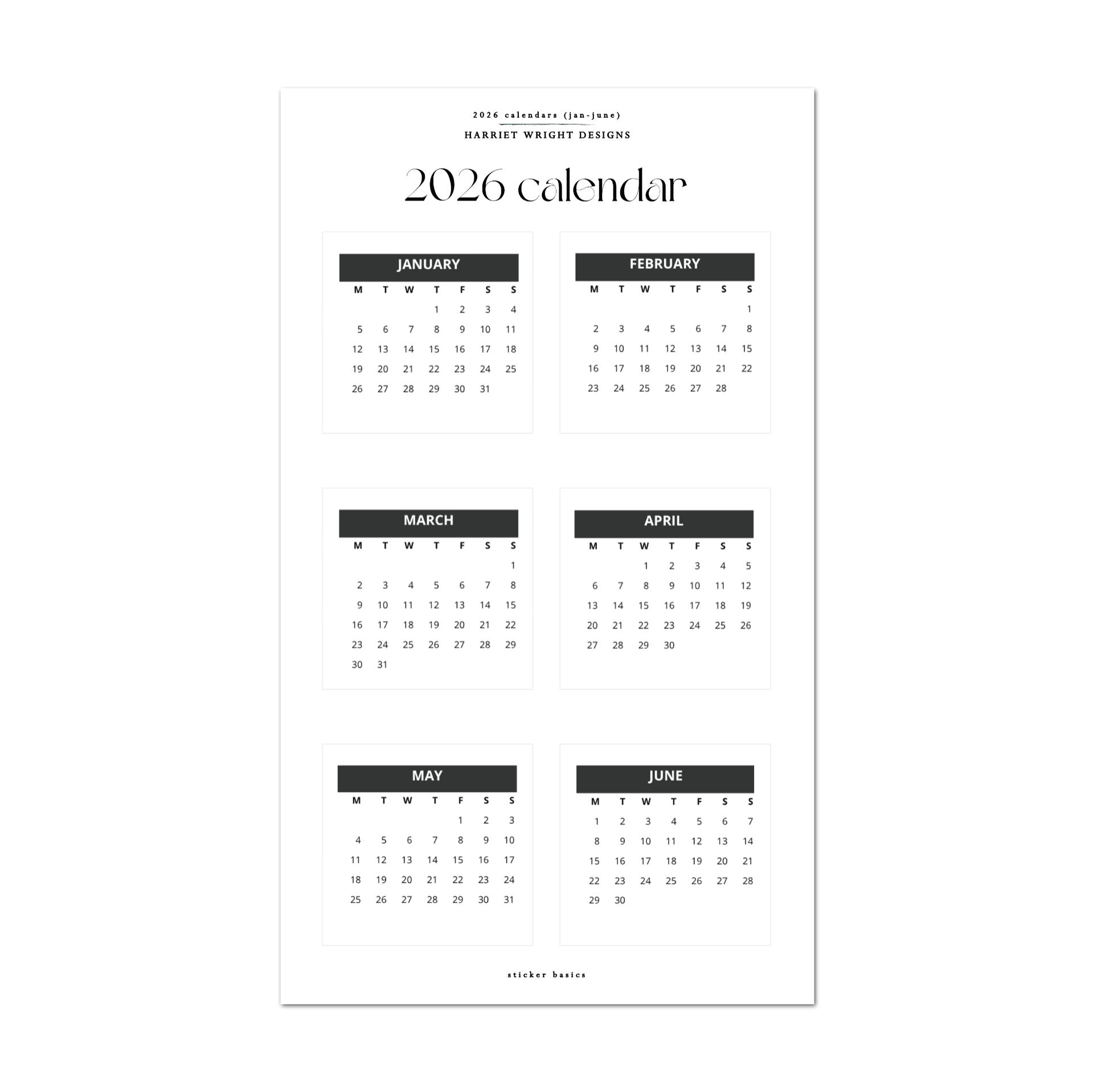 2026 Calendar (Jan-June) - Black | Sticker Basics